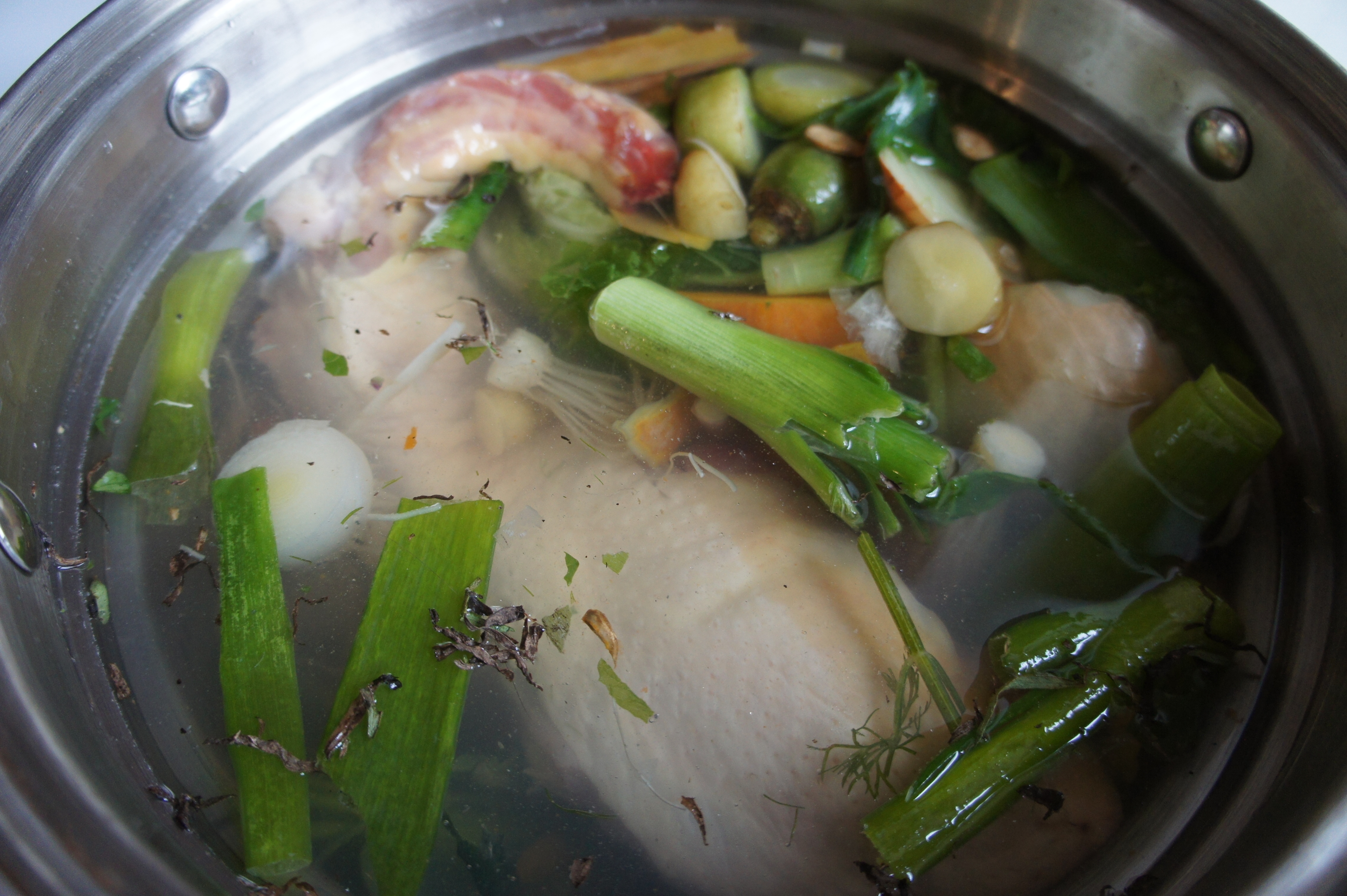 - 1 whole free-range chicken or 2-3 lbs of bony chicken parts such as necks, back, breastbone and wings, or the carcass from a roasted chicken plus chicken feet