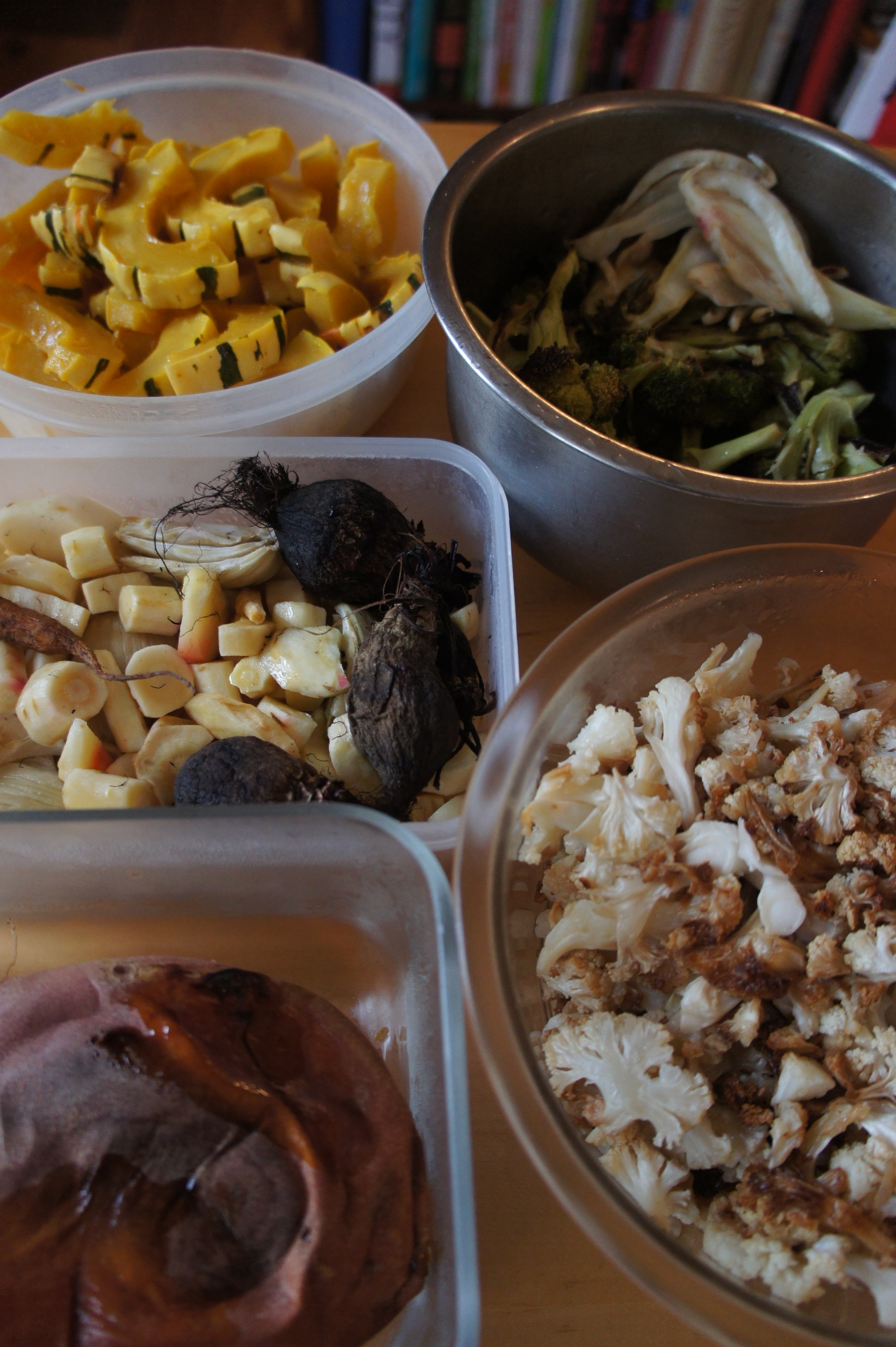 In a chapter entitled, How to Stride Ahead, Tamar recommends roasting a whole bunch of different vegetables at the beginning of the week to have them as building blocks for a host of different meals throughout the week. I’d never thought of this, and as time is precious and limited and I want to eat delicious healthy food at every meal, the concept is appealing. Often, when I realize I’m hungry, it’s too late to cook something because I want to eat right now, so I’m trying to do a better job at planning ahead. I used to eat a lot of canned tuna and chips and salsa because I wasn’t planning well, but the idea here is to have readily available raw materials with which to compose a salad, side, frittata or soup.