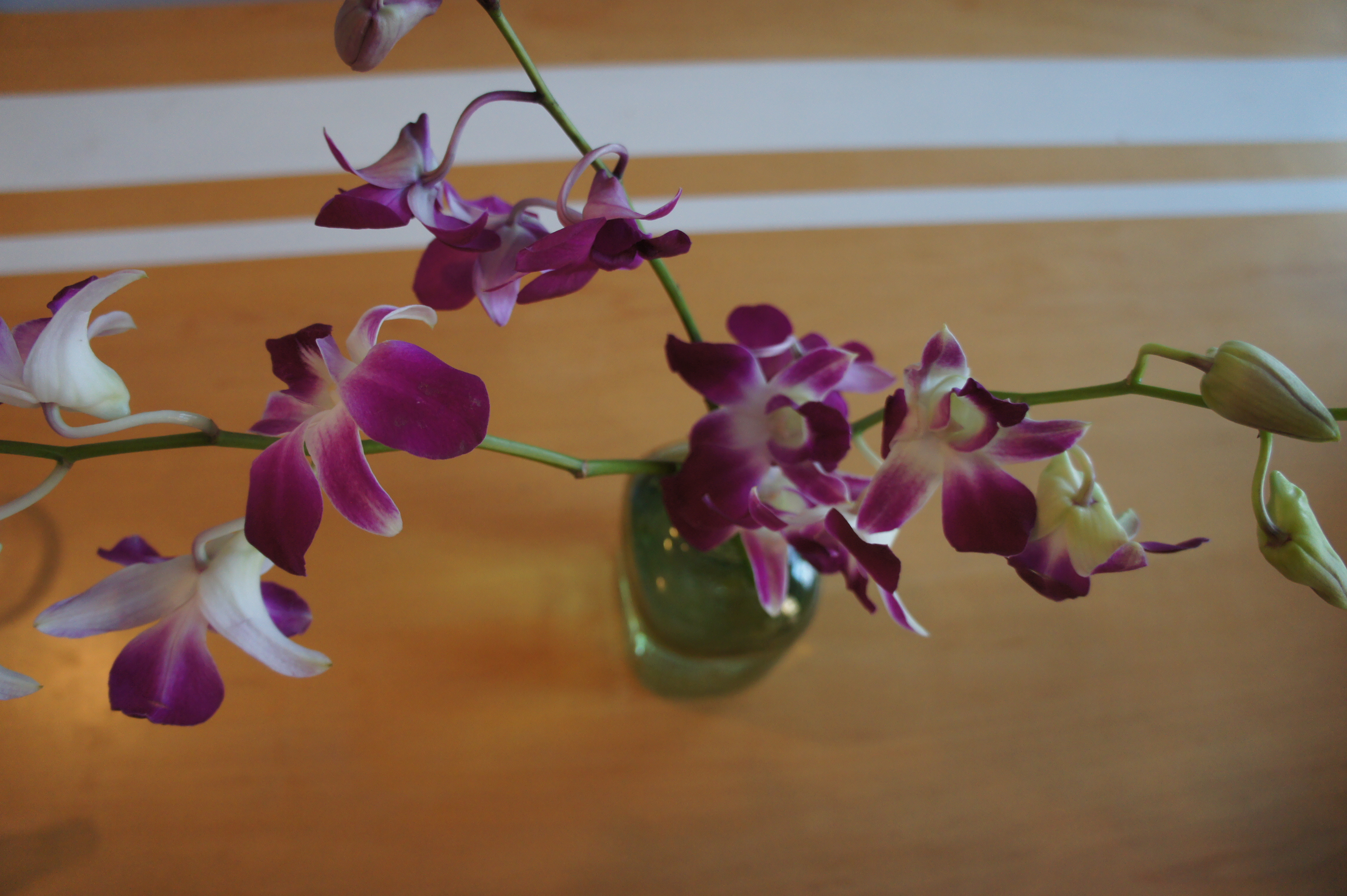 Even though I do not regret my particular path and challenges knowing they have shaped me into the person I am today, I experienced a little twinge of jealousy when talking with my friend about her upcoming visit with her grandmother, who is both still alive and cognitively sound. I felt such wistful sadness missing my grandmother and looking back at the seven years of Alzheimer’s we suffered through. January 18th marks the third anniversary of her death; the one where she rolled up into a tiny leaf in the bed while I played sweet sad songs on the little stereo brought to the bedsides of dying people in the nursing home, massaging her increasingly cold feet as she slowly withdrew, going home to sleep on one night of the bedside vigil and coming back on a Sunday morning to sit by her bedside, just she and I together in the room as she passed on. Seeing her take her last breath was as profound, I learned in that moment, as seeing someone take their first breath. During those years, I witnessed her return to a sort of fragile infancy, the full circle we often reference. She embodied the delicate, restrained beauty of an orchid, both in life and death. On Monday my friend Craig came for a visit and walk, bearing graceful purple orchids, now gracing my table.