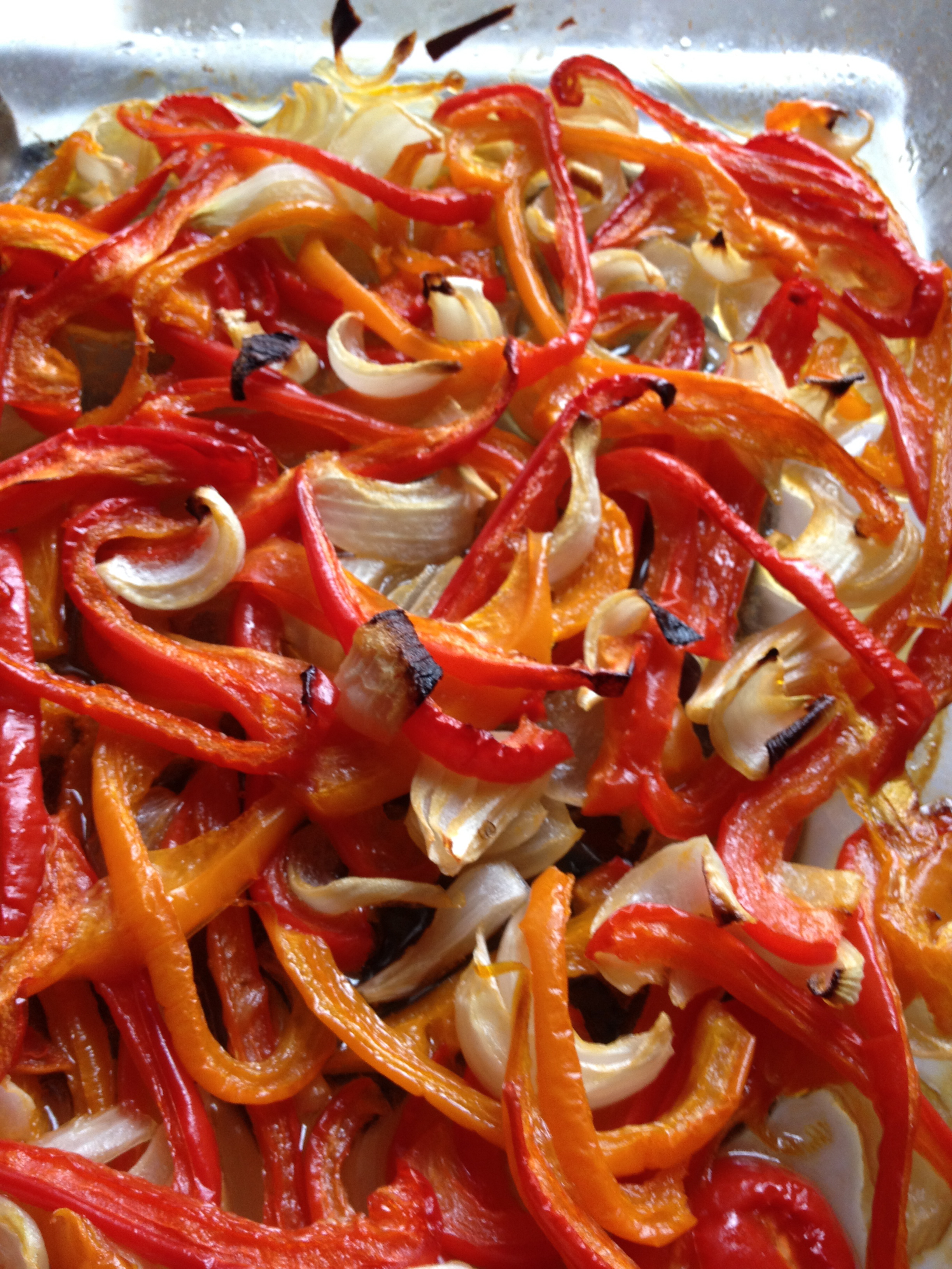 Roast thinly sliced peppers in onions that you’ve tossed with olive oil and salt at 400• for about 30 minutes or to desired done-ness.