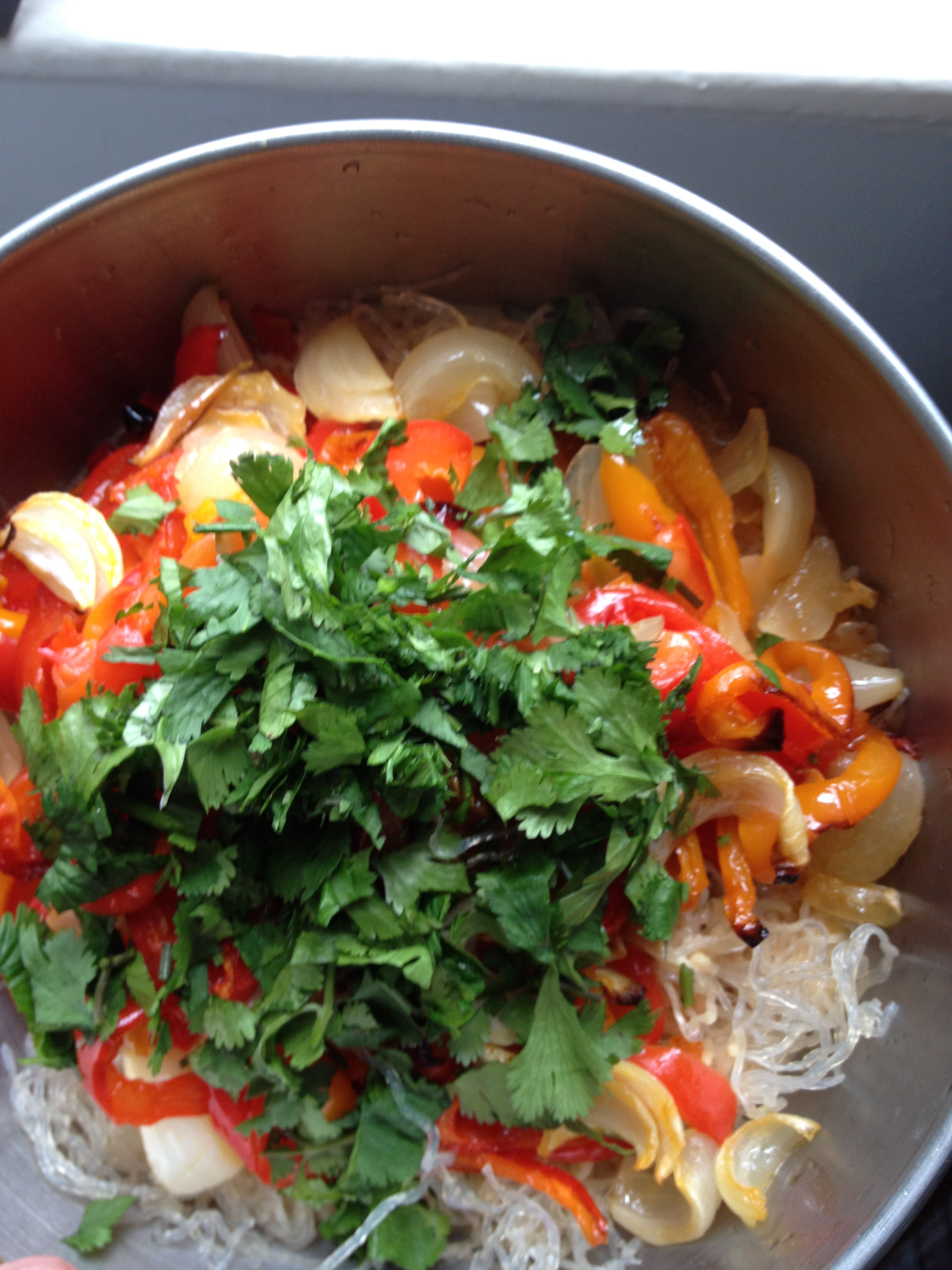 Toss everything together and top with chopped fresh cilantro or parsley, scallions, bean sprouts, peanuts.