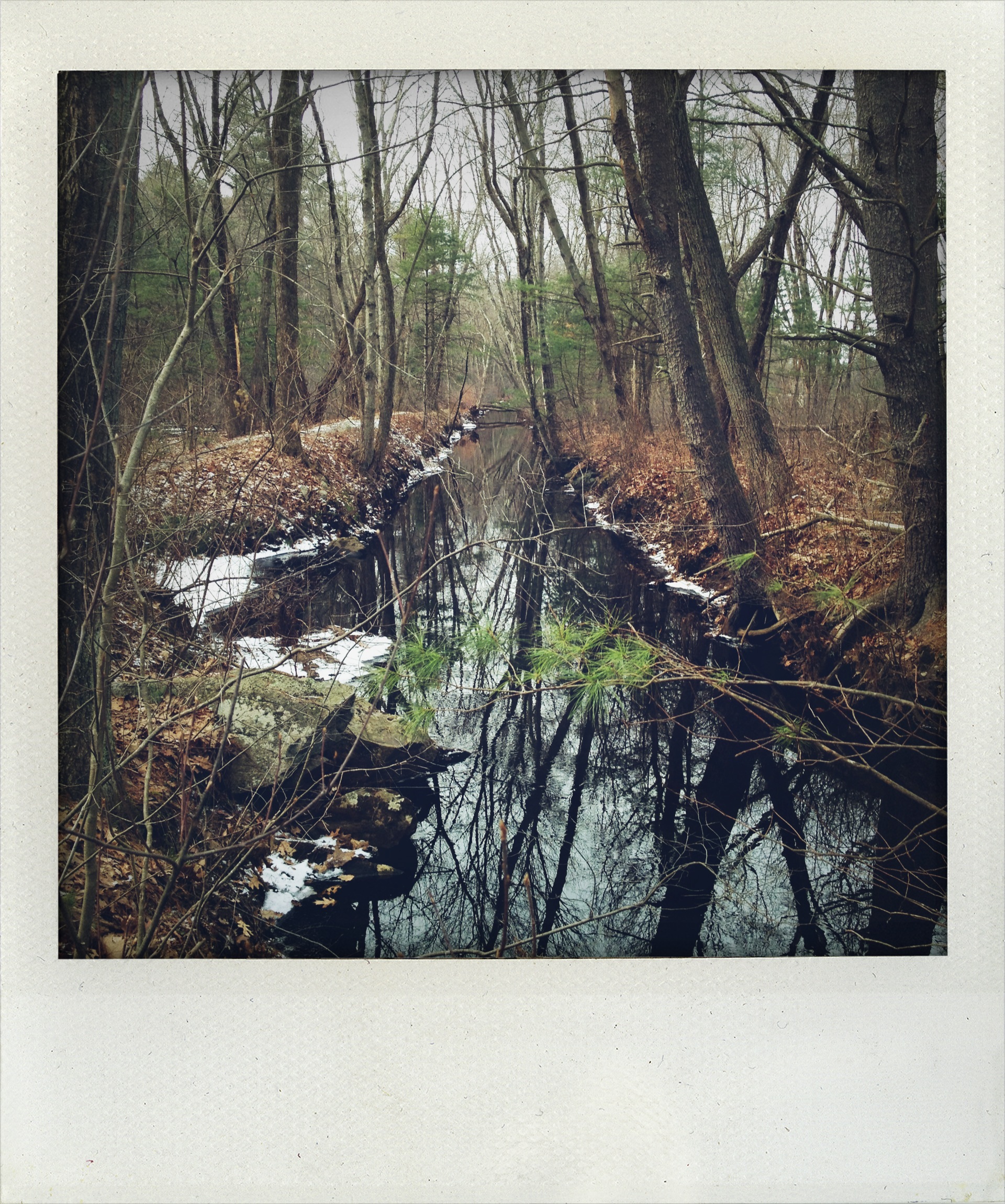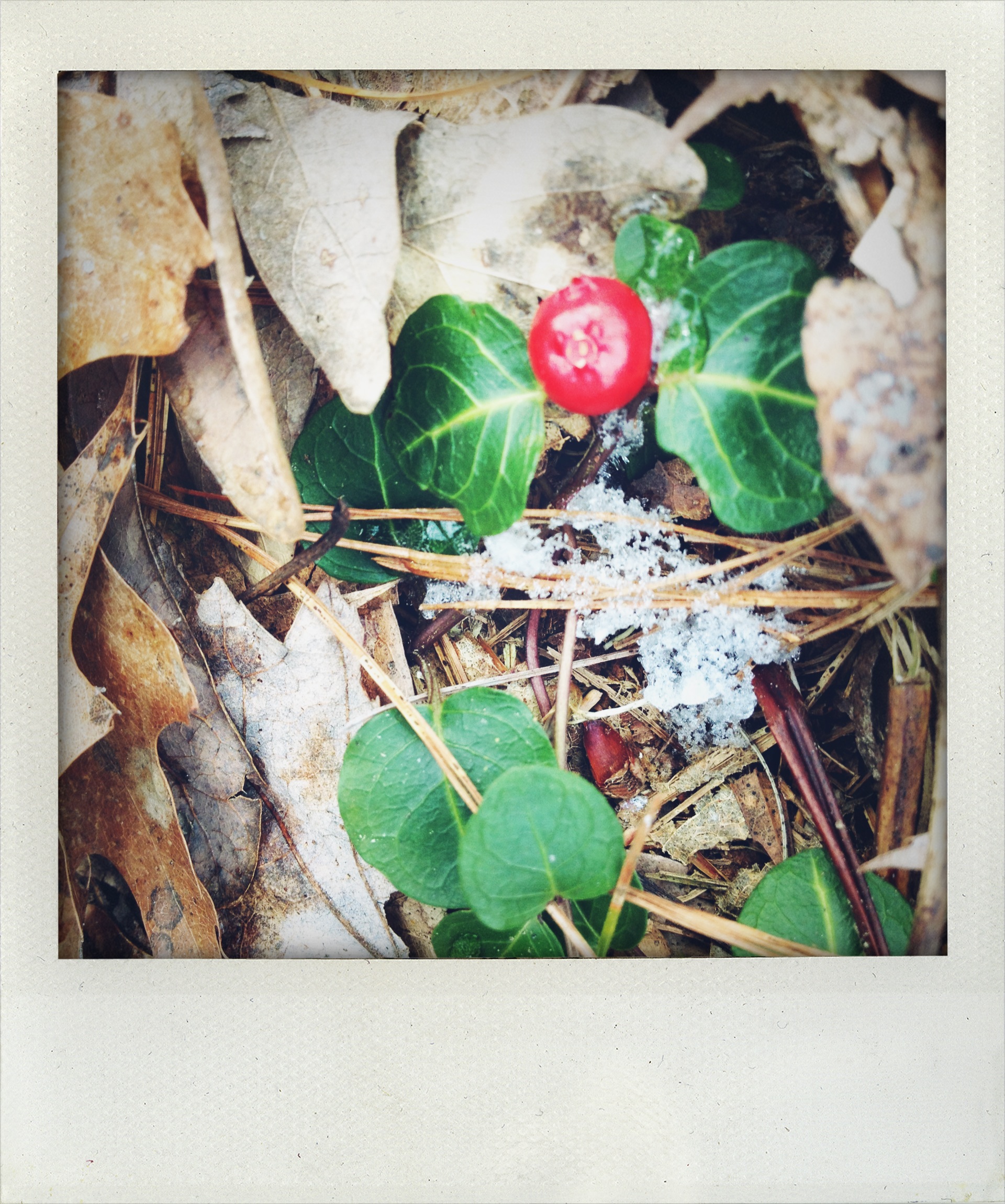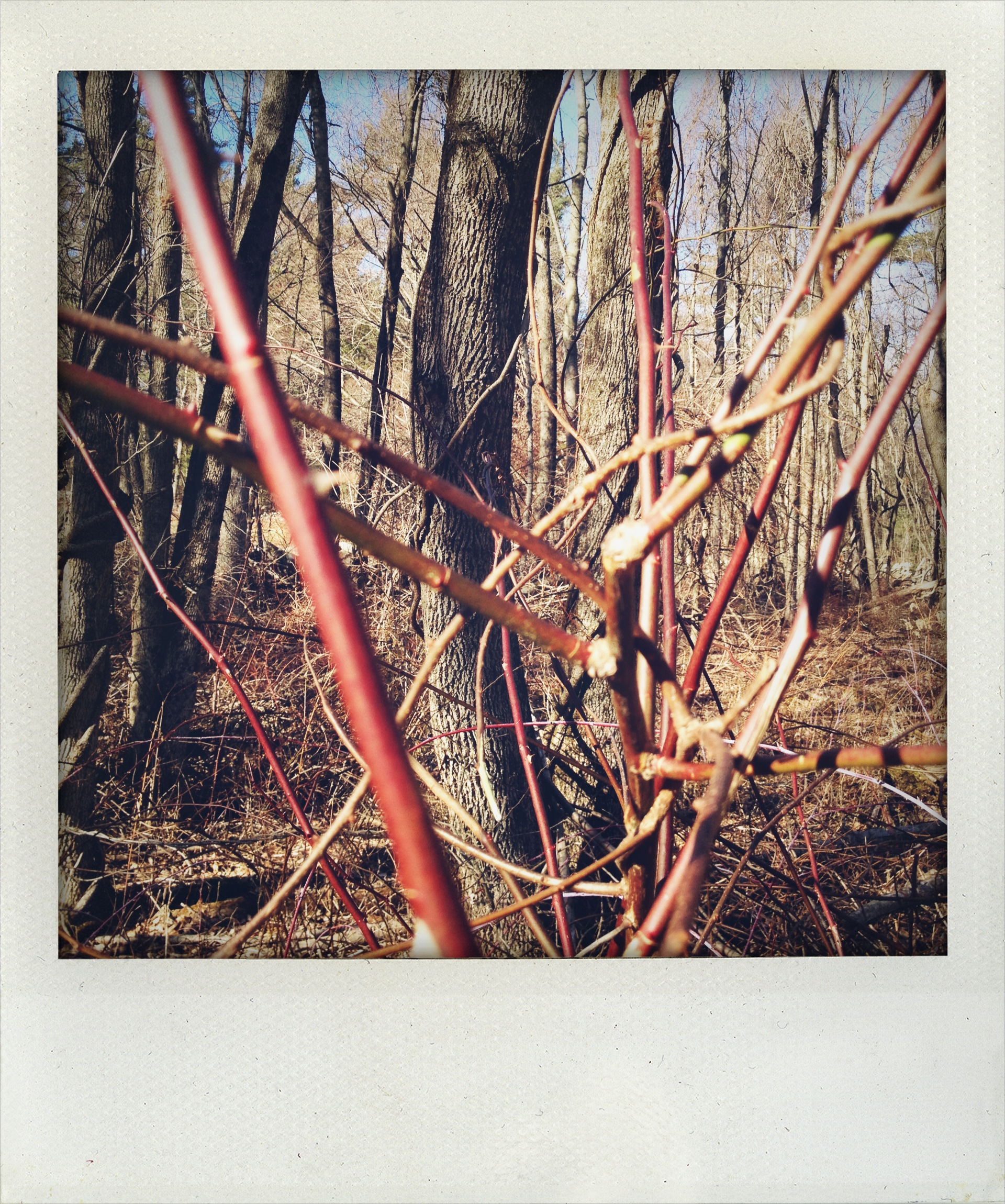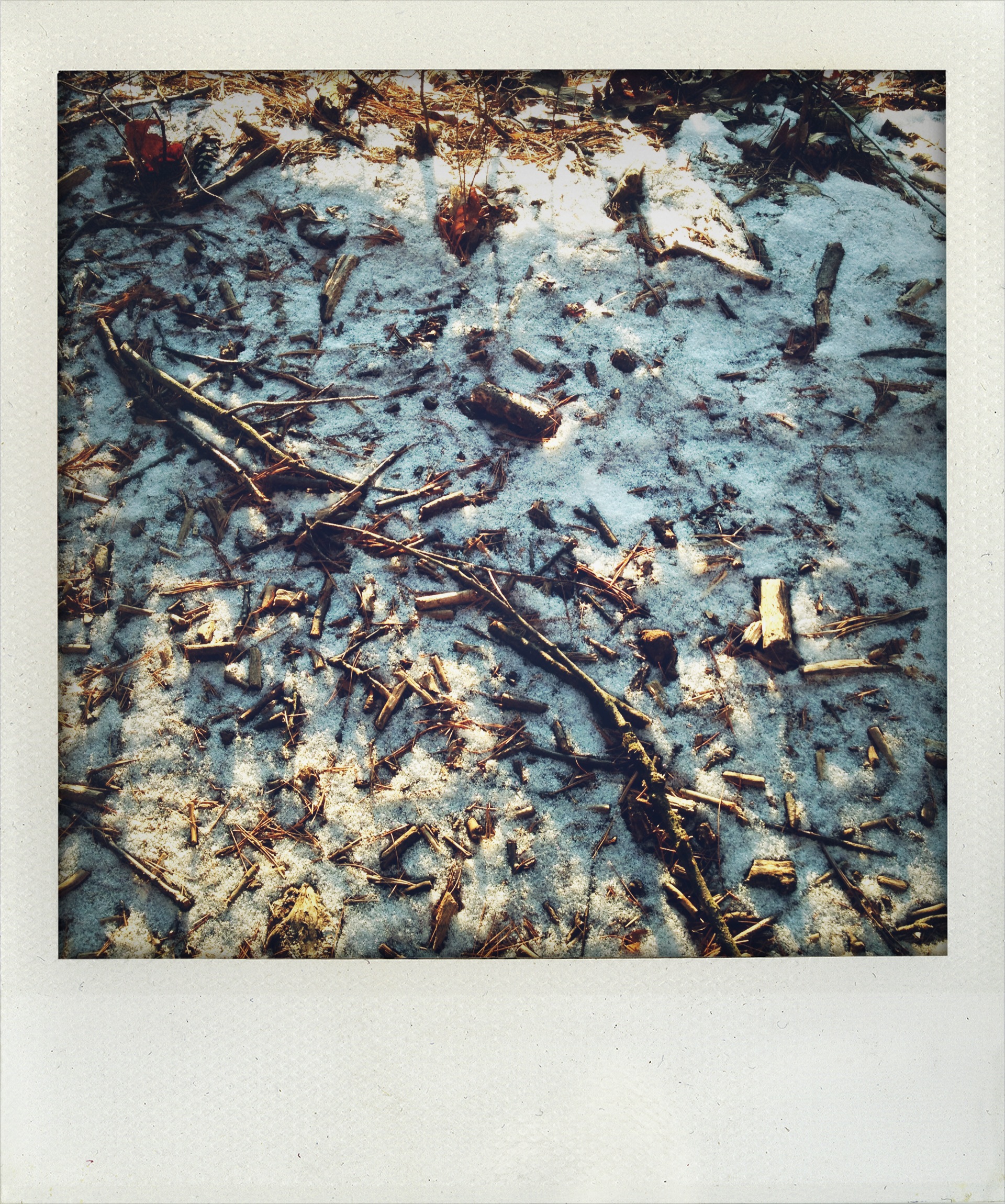 For the last two weeks, I’ve been taking my iPhone to the woods every day when walking the dogs, excursions I’ve dubbed as Polaroid walks. SnapItPhoto app, how I love your real Polaroid sound and required shaking-to-expose feature, bringing me back to the real thing we used when I was a kid, (by the way I acquired a real one from Chris’s grandmother, but do not currently have any film…) These journeys remind me to look for color and composition everywhere I turn so the concept of searching for frame, light and little pops of brightness and nuance in a winter palate of white, ochre and grey, pervades even after I’ve put my camera down.