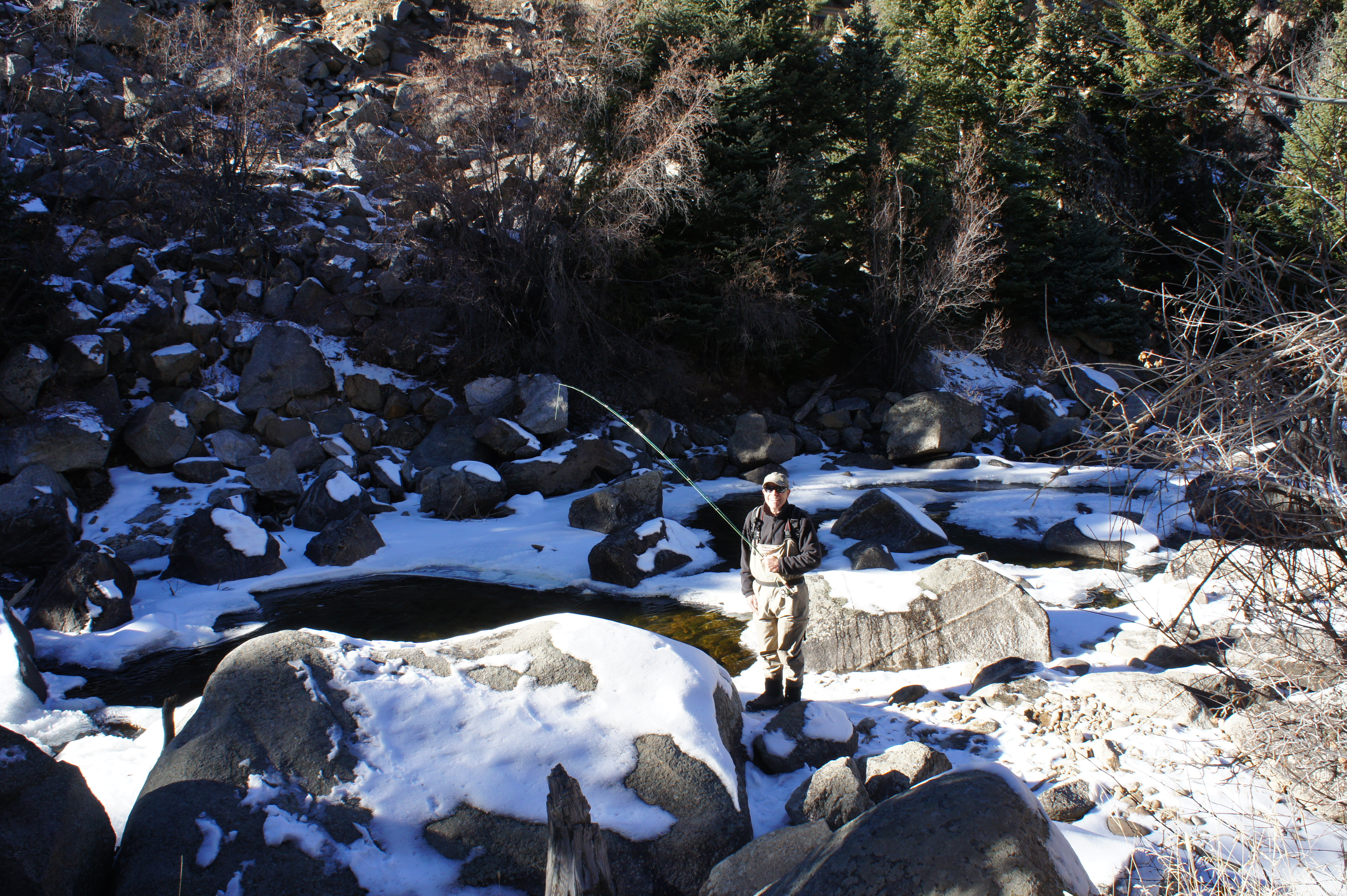 Last year Pam and I went on a hot air balloon ride and this year we fly fished, Chris Keith and I (Keith’s and my first time ever) with Antonio, our guide from Quimba Portugal. He was serious but twinkle eyed. He moved here in July and his wife and two daughters aged two and six are slated to join him in June. He was patient and I was afraid I’d have to do lengthy false casts back and forth to project the line like I’ve seen Chris do on large rivers and the ocean but these were short casts into the cold Boulder creek. The first spot was chilly and shady and an hour and a half later (no fish for me or Chris but two for Keith who was stationed further down the river) my fingertips and toes were getting numb and I looked at my watch and wasn’t sure how I’d last two and a half more hours. We had good boots and waders from the company and a lot of layers of clothes but Antonio could tell I was frozen so we got in the car and moved to a sunnier spot. Suddenly, in typical first trimester form, I knew I had no choice but to take a quick nap, so with the car pointed at the sun and the boys down stream fishing, I sunbathed and slept for fifteen minutes. I sat there for another ten after waking up and then made my way down and found Keith. Chris caught two trout and Keith caught three.