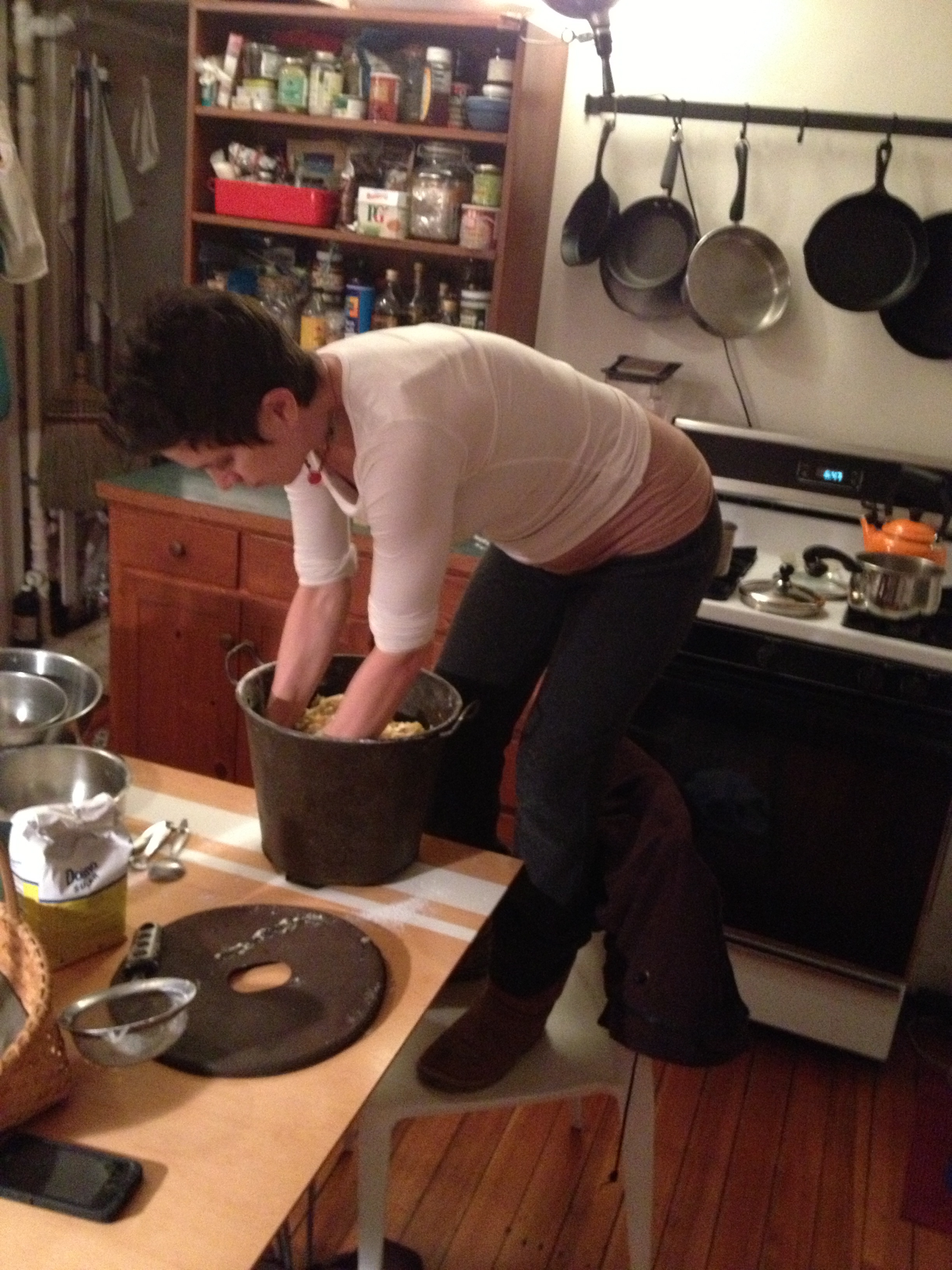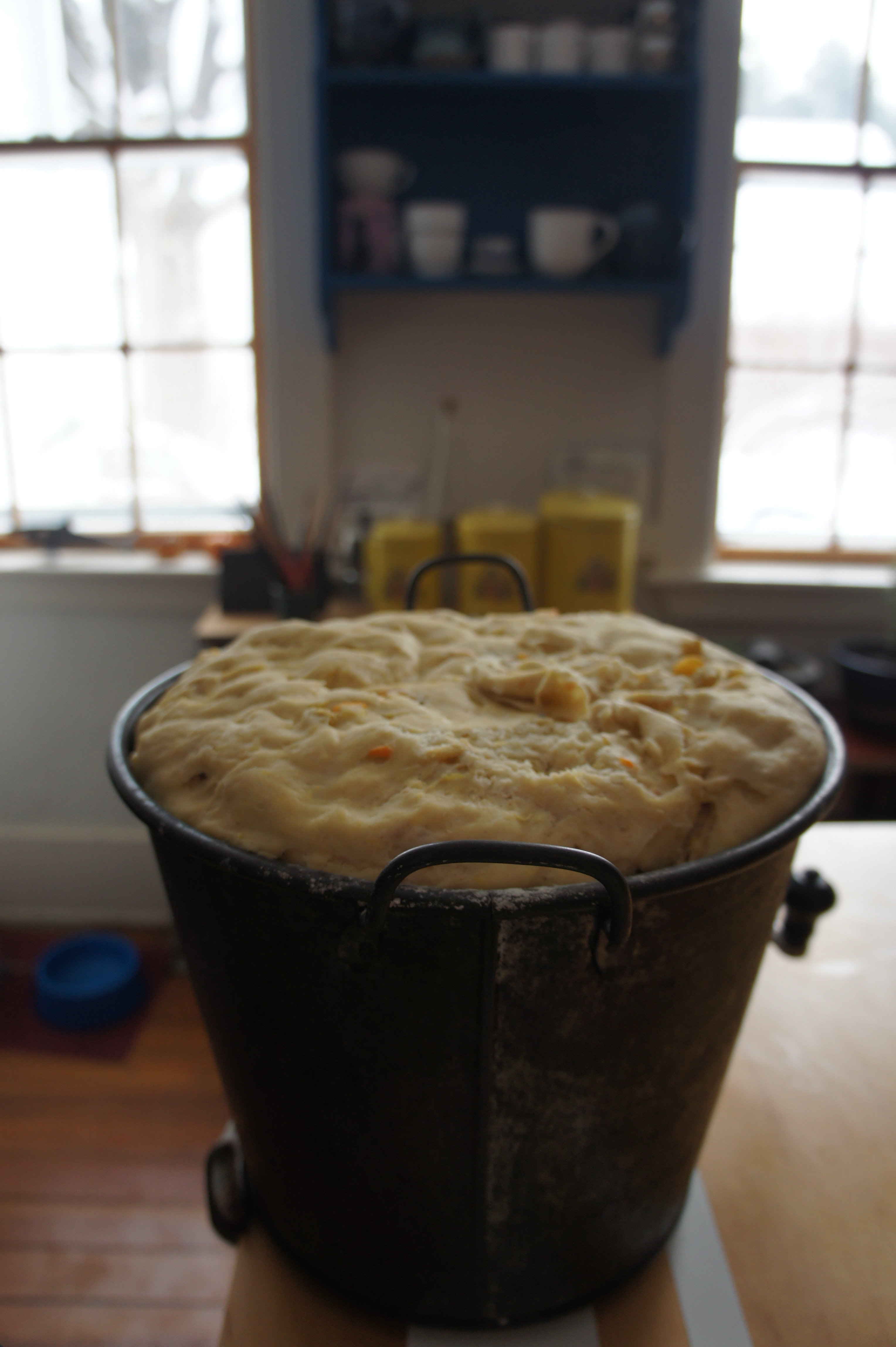 There is so much to say, and have been so many blog entries and essays started and stopped during a hectic time that I’m going to let my photos do the telling for now. I baked a lot during the past two months and revisited two favorite bread recipes I hadn’t made in over ten years; the quick bread being amazingly easy yet sophisticated. Scabby decided to gobble the top off one of the raisin breads (did you know raisins are toxic to dogs and can cause renal failure?) but I’ll save that story for another day. We intervened and he’s just fine now. Pregnancy has me craving and eating more bread than I usually eat, usually being hardly any… This week’s craze? Toast with ghee and thick orange marmalade topped with thinly sliced extra sharp cheddar. I will post the orange cardamom bread soon: the recipe comes from a dear family friend and is no where online to be found! Also hard to find: bread pails/buckets or recipes for them. What an amazing low tech contraption to make turning out ten loaves at a time a cinch!