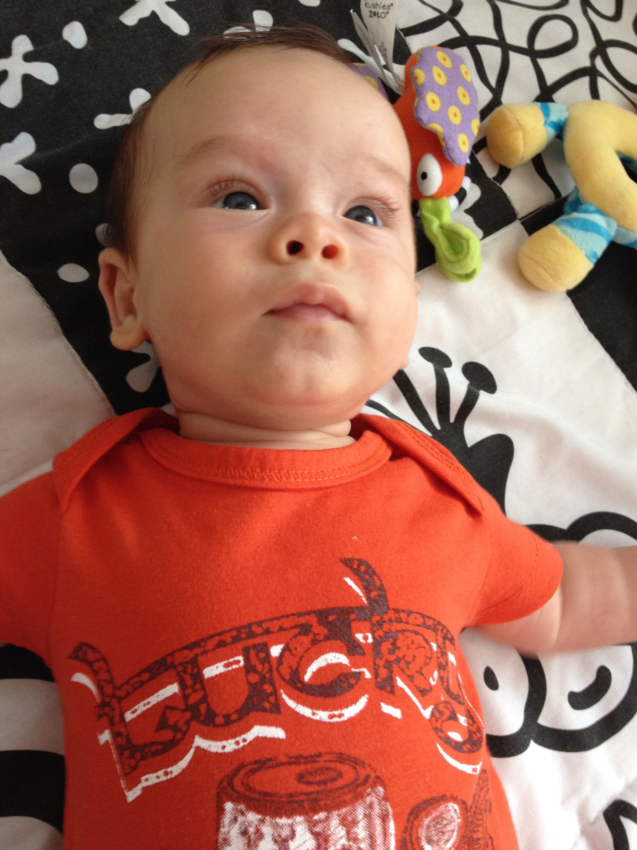 You are three months old today, my sweet boy. I can see you growing right before my eyes and we’re onto the next bin of hand-me-down clothes that looked so large once. Your belly is round, legs chubbing up the way breast-fed babies get. In light of the fact that our first six weeks were filled with frustration because come to find out, your tongue and lip ties were interfering with breast-feeding and you were slow to grow and gain, this makes your Momma very happy. I have worked determinedly to increase my milk and it’s working- we need no supplementing. Gone is the curled up fuzzy newborn you, cross eyed and flopsy. Now you are blight-blue-eyed and drooling up a storm, teething already. You smile most energetically in the early morning, and you’re a gassy guy, writhing next to me in your sleep until I lift you to burp or place you on my chest where, prone, you can work it out. I can tell already that you’re sensitive and intense. You’re also cuddly. I’m always playing music and singing, making up nonsense songs to accompany every activity. You put up with being in your swings or chairs for about twenty minutes tops. You’re batting at the toys that dangle from your activity mat. You lift your chest and head and can turn it from side to side when you’re on your tummy, and it is hard to believe that time is passing and you are changing and growing exponentially. I want to hold on to the tenderness of these early times, encapsulate it, but I know already that the overarching themes of parenthood are motion and flux, adjustment, flow, surrender. Caring for you is engulfing. As Harriet Lerner writes, “To opt for kids is to opt for chaos, complexity, turbulence and truth. Kids will make you love them in a way you never thought possible. They’ll teach you that you are capable of great compassion, and also that you are definitely not the nice, calm, competent, clear-thinking, highly evolved person you fancied yourself to be before you became a mother. Your children will call on you to grow up.”